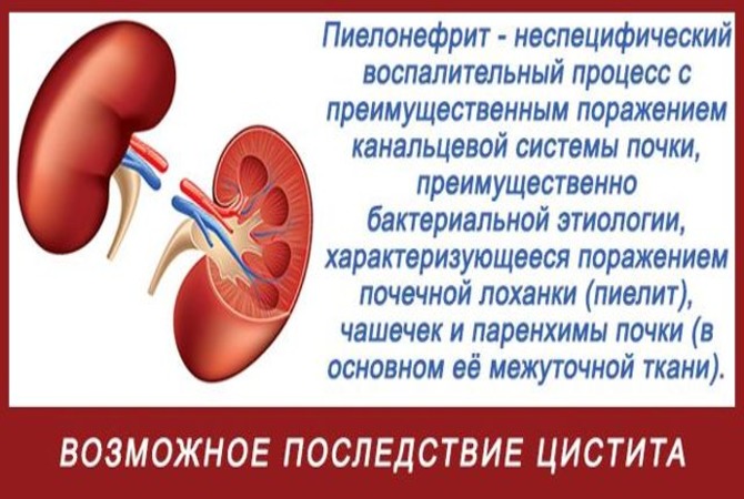 Распространённое осложнение воспаления мочевого пузыря – поражение почек. Развитие пиелонефрита обусловливает переход воспалительного процесса с мочевого пузыря вверх по мочеточникам. Заболевание сопровождается гипертермией, болью в пояснице, нарушением мочеиспускания и другими нарушениями. В этом случае пациенту показана госпитализация в отделение нефрологии или урологии.