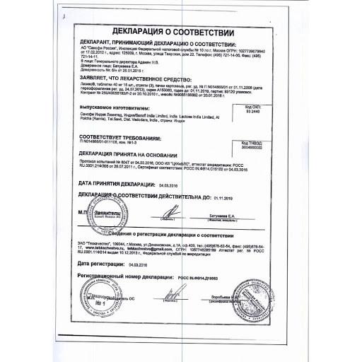 Дополнительные компоненты представлены в виде: моногидрата лактозы, микрокристаллической целлюлозы, кросповидона, стеарата магния.