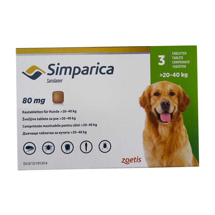Для собак весом от 20 до 40 кг рекомендуется одна таблетка Симпарика 80 мг.