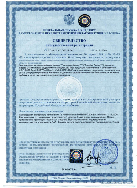 Первый продукт линии 4Life Трансфер Факторов для ежедневной поддержки иммунной системы и нормального функционирования организма – гипоаллергенный иммунонутрицевтик, полученный из молозива коров, содержащий цитокиновые фракции, идентичные лейкоцитарным цитокинам. Преимуществами его применения перед другими известными иммуномодуляторами являются природный характер, универсальный механизм действия и отсутствие противопоказаний (из Методических рекомендаций МОЗ и АМН Украины)