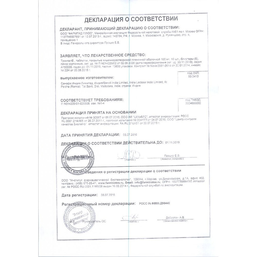 Инструкция Трентал