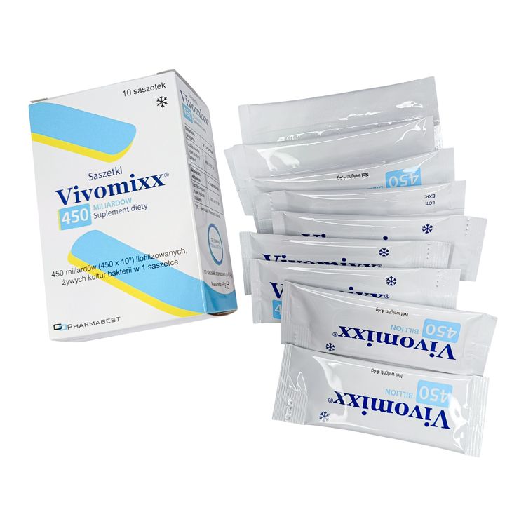 Vivomixx – это пробиотический препарат, созданный по запатентованной формуле De Simone Formulation. Каждый саше содержит 450 млрд лиофилизированных (высушенных особым способом) бактерий, представляющих собой 8 тщательно отобранных штаммов. Препарат направлен на поддержание и восстановление здорового баланса микрофлоры кишечника, что в конечном итоге способствует нормализации пищеварения и укреплению иммунной системы.